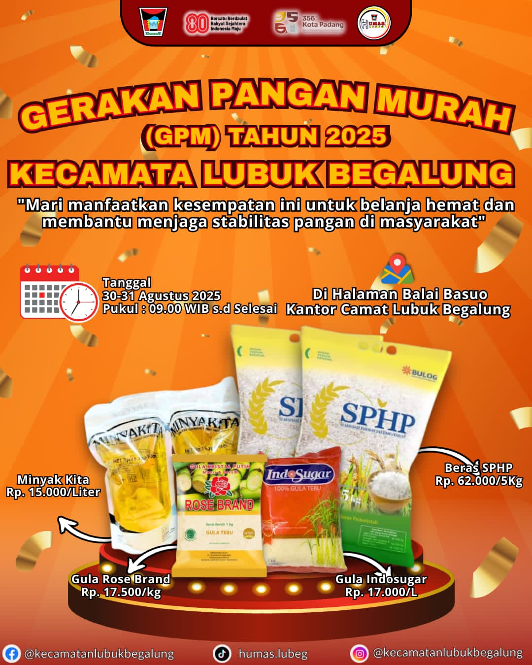 Hari itu, Kecamatan Lubuk Begalung menjadi tuan rumah Gerakan Pangan Murah (GPM) Tahun 2025. Program ini merupakan inisiatif pemerintah untuk menekan harga pangan dan memastikan masyarakat tetap bisa berbelanja hemat, meski harga kebutuhan pokok di pasar kerap berfluktuasi.