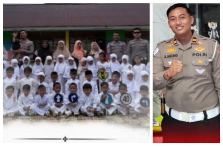 Di hadapan anak-anak, IPTU Agung mengawali dengan senyum ramah dan sapaan lembut. Ia lalu menunjukkan satu per satu rambu lalu lintas kecil berwarna biru, kuning, dan putih. Tangannya yang kokoh memegang papan rambu seakan sedang bercerita. Anak-anak yang duduk di barisan depan tampak berebut menjawab setiap pertanyaan.