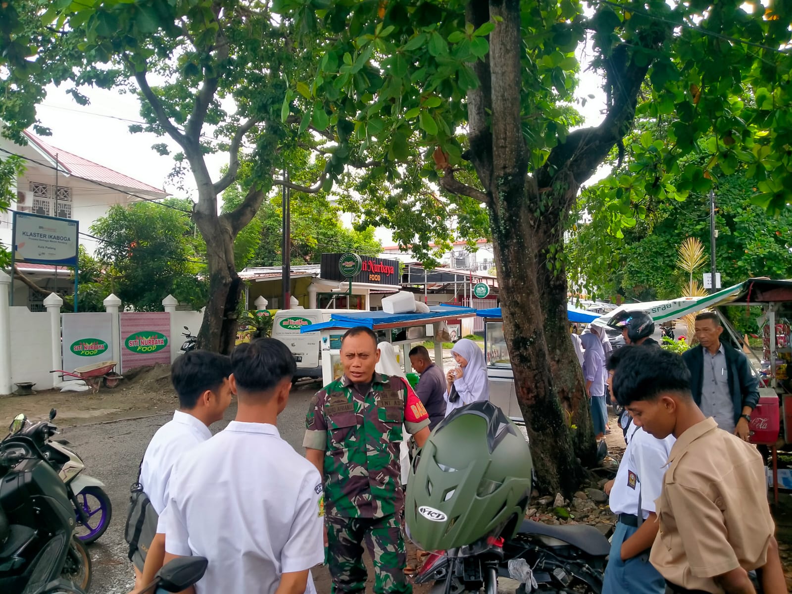 Kegiatan ini dilakukan di tepi jalan lingkungan yang menjadi jalur aktivitas siswa, dimana terlihat sejumlah pelajar berkumpul dan berdialog langsung dengan Babinsa. Suasana berlangsung santai namun penuh makna.